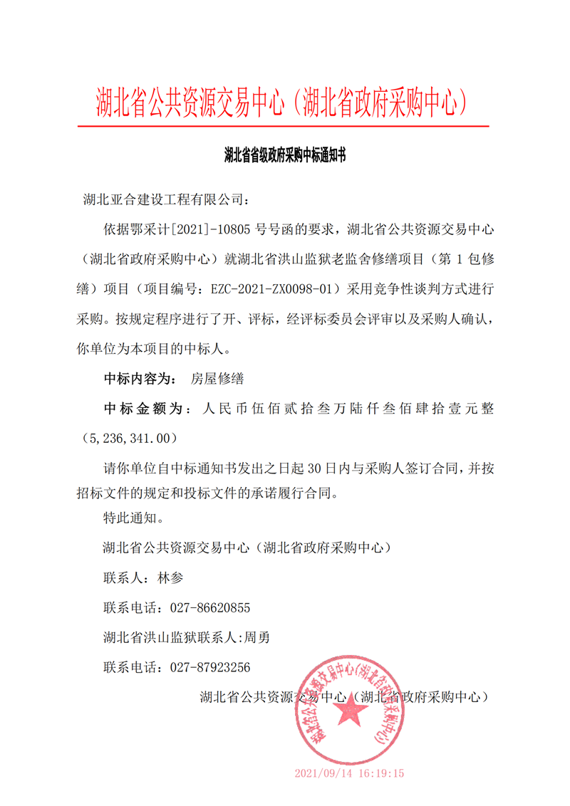 熱烈祝賀湖北亞合建設工程有限公司在《湖北省洪山監獄老監舍修繕項目》中標!